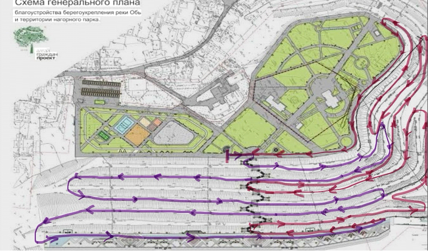 Дистанция 4 км, первая часть дистанции преимущественно вниз к реке, отмечена фиолетовым цветом, вторая часть дистанции отмечена розовым цветом, преимущественно вверх от реки.