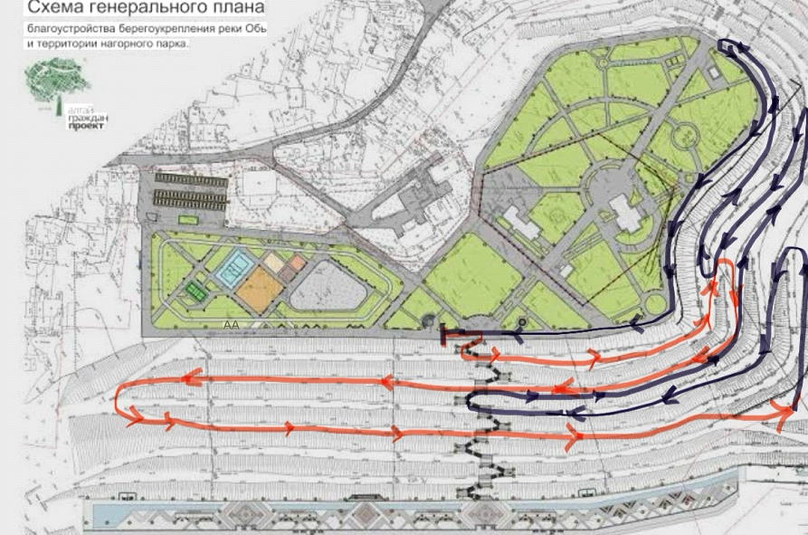 Дистанция 2,5км, первая часть дистанции преимущественно вниз к реке, отмечена оранжевым цветом, вторая часть дистанции отмечена темно-синим цветом, преимущественно вверх от реки.