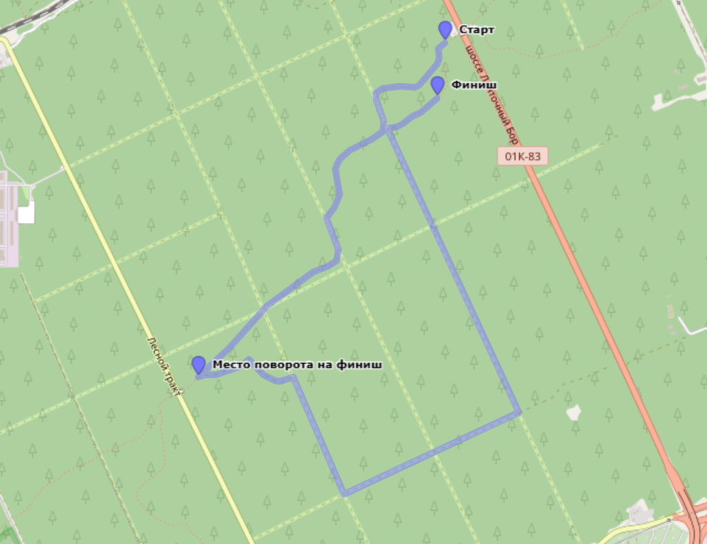 Краткое описание для знающих Трассу здоровья: 1 круг между мостами по разметке (желтые и зелёные круги на деревьях) по ходу движения. Старт на 5-м км Трассы здоровья. Финиш немного не доезжая до 5-го километра Трассы здоровья.